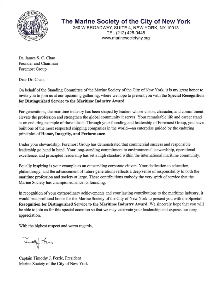Capt. Tim Ferrie, President of the Society, said: “Dr. James S. C. Chao’s distinguished career truly reflects the enduring mission of the Marine Society of the City of New York. For more than sixty years, Dr. Chao has led Foremost Group with the values of honor, integrity, and performance. Like the Marine Society itself, Dr. Chao has long championed the safety, welfare, and education of seafarers. It is our great honor to welcome Dr. James S. C. Chao as an honorary member of the Marine Society of the City of New York.”