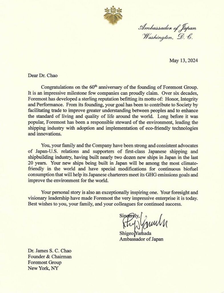We are deeply honored to present a distinguished message from Ambassador Shigeo Yamada of Japan in commemoration of Foremost’s 60th anniversary. Featured below is a picture of Ambassador Yamada’s letter, accompanied by a video recording of his congratulatory address, which was showcased during our anniversary celebration. The Ambassador’s remarks eloquently highlight the enduring partnership and mutual respect between Foremost and Japan. His acknowledgment of our unwavering commitment to honor, integrity, and performance, as well as our pioneering efforts in incorporating environmentally friendly technologies, underscores the significance of our longstanding collaboration. We extend our profound gratitude to Ambassador Yamada for his gracious words and unwavering support, and we look forward to continuing our successful partnership for many years to come.